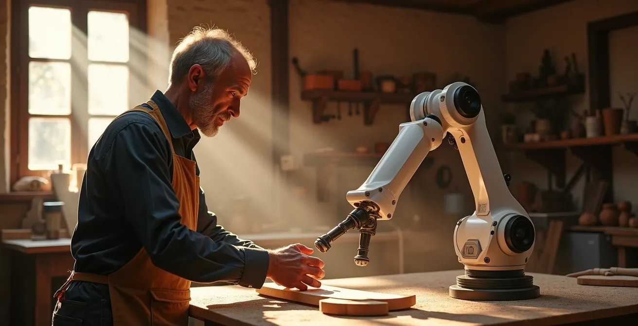 E se la vera innovazione non fosse sostituire l’uomo, ma potenziarlo? Se la tecnologia, invece di snaturare il gesto artigiano, potesse liberarlo dalle sue catene più pesanti? Questa è la promessa dei robot collaborativi, o cobot. Non si tratta di automazione spersonalizzante, ma di un nuovo paradigma: l’Artigianato Aumentato. Un modello in cui il robot diventa un “super-assistente” che si occupa dei compiti più faticosi e ripetitivi, lasciando al maestro artigiano ciò che nessuna macchina potrà mai replicare: la creatività, l’esperienza e quel “tocco umano” che trasforma un mobile in un’opera d’arte.